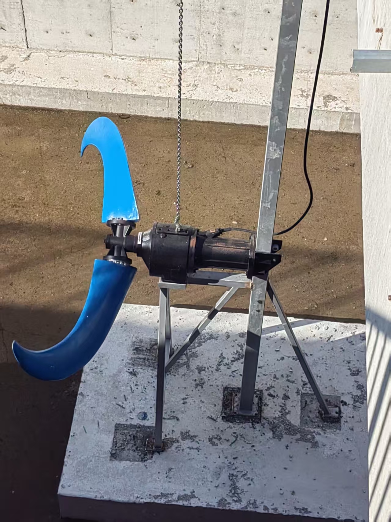 潛水推流器為成套裝置,包括安裝系統(tǒng)和提升裝置。安裝系統(tǒng)由方鋼導(dǎo)桿和頂部部和底部支座等組成,可自由調(diào)整推流器的提升和下降, 并可在不排空水池的情況下拆卸和安裝推流器。低速推流器裝在一個(gè)可在導(dǎo)桿上滑動(dòng)的支架上作為一個(gè)整體,支架能夠承受推流器的整個(gè)重量和造成的所有推力。